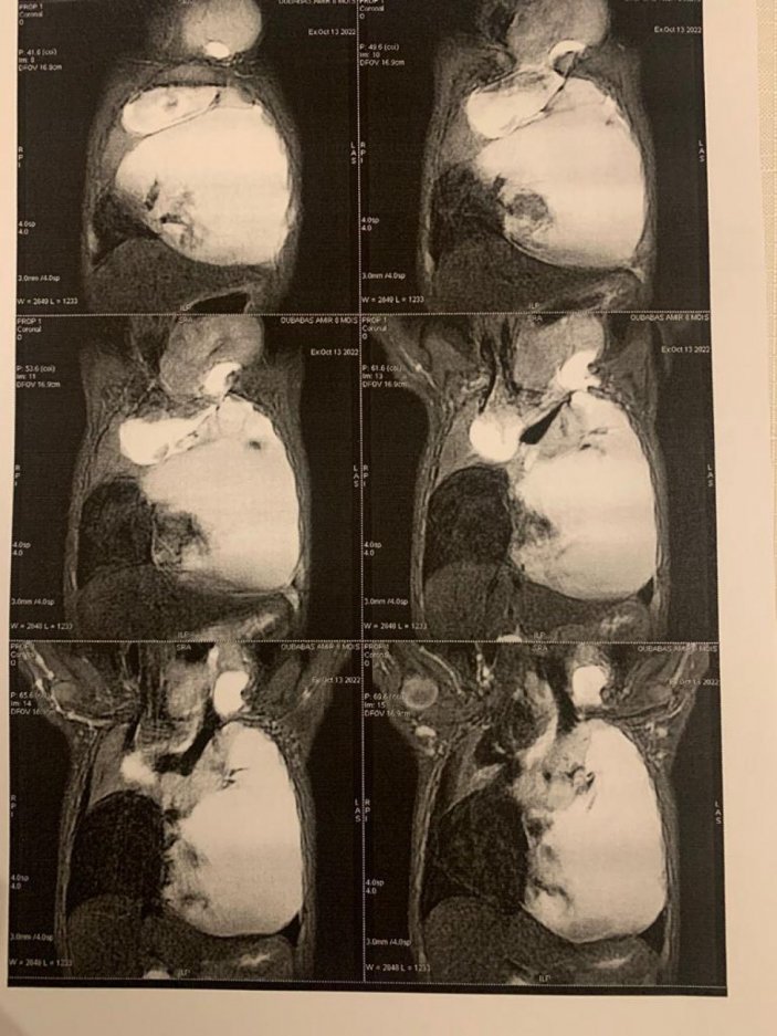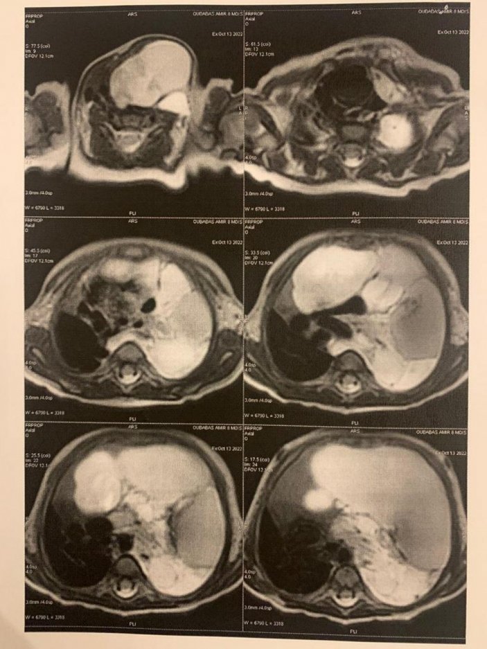Biz gerekli hazırlıklarımızı yaptık. Burada Doç. Dr. Melih Akın ile birlikte ameliyatı planladık. Operasyon gayet başarılı geçti. Boyundaki, sol akciğerdeki ve göğüs kafesi kitlesini başarılı bir şekilde çıkardık. Sonrasında da hastamızı sağlıklı bir şekilde ülkelerine mahkûm etti. Hasta ameliyata şöyle bir sorun olurdu; bu taramadaki kitle, artık kalbine de bası taşıyor. Göğüs kafesinin içinde bulunan büyük damarlara kadar bası gidiyor. 7 ay zaten artık iyice ilerlemiş bir geçmişimiz var. Bazı kalplerden kaynaklı problemler de yavaş yavaş gelişmeye başlamıştı. Kitleyi çıkarmasaydık yaşama şansı olmayacaktı.”