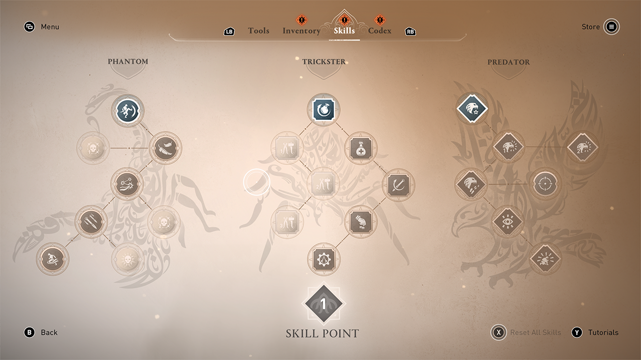 Oyunda üç dala bölünmüş basit bir yükseltme ağacı bulunuyor ve Basim’İn becerilerini ve yararlı eşyaları taşıma yeteneğini artırabiliyoruz. İki beceri dalı tamamen Basim’e odaklanırken, Assassin’s Concentration adı verilen yeni teknik, bunu yapacak ‘konsantrasyona’ sahip olduğumuz sürece zamanı durdurarak bizi doğrudan hedefe ışınlayarak seçtiğimiz düşmanlara bir suikast dizisi gerçekleştirmemize olanak tanıyor.