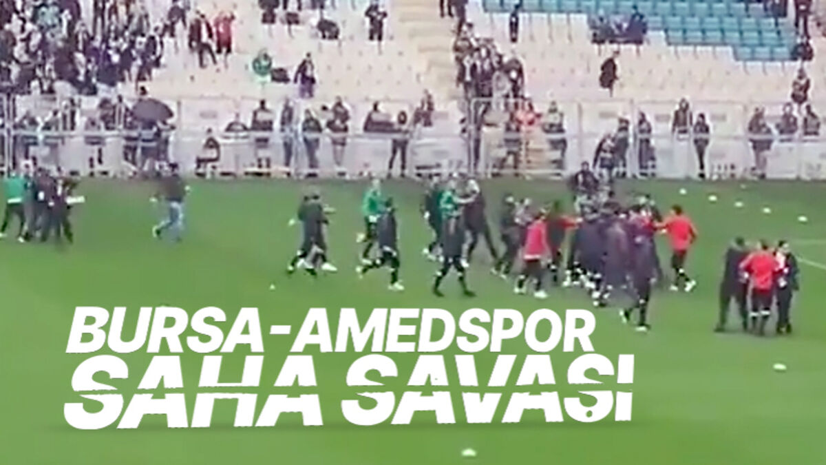 Bursaspor’un sahasında Timsah Arena’da oynanacak maç öncesinde konuk ekip Amedspor oyuncularının ısınma hareketleri için sahaya çıkması ile birlikte iki takım arasında büyük bir kavga yaşandı.