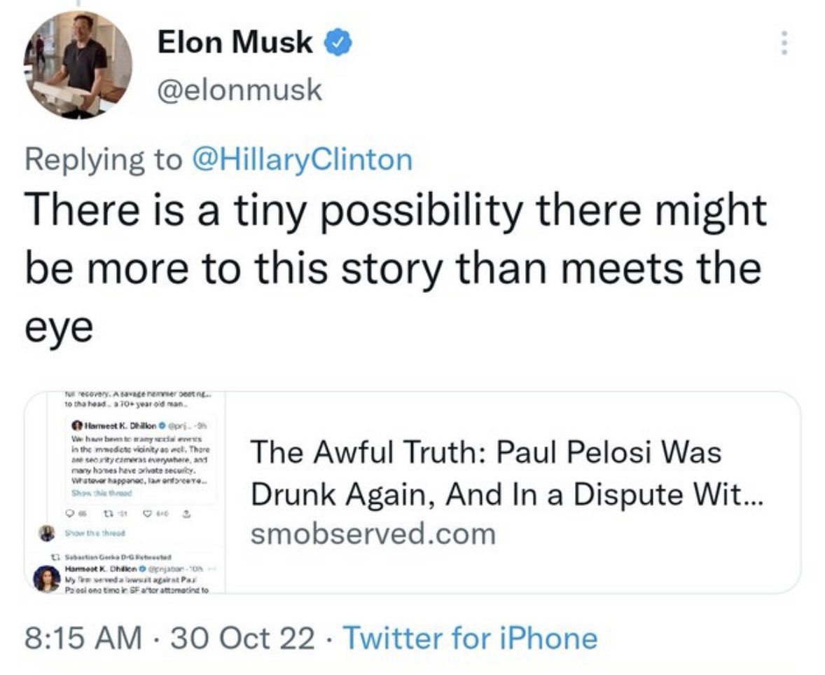 Sözlü konuşma yazıları Paul Pelosi’nin cinsel yaşamına ilişkin asılsız açıklamalar yeniden başlatıldı, Pelosi’nin sarhoş olduğu ve saldırı gecesi bir erkek eskortla kavga ettiği iddia edilmişti. Bu iddiaların her ikisinin de yanlış olduğu ek araştırmalar ve polis tarafından yapılan açıklamalarla kanıtlandı. Musk’ın özür dilemesine neden olan tweet’i “Bu hikâyede kullanımlarından daha fazlasının olabileceğine dair küçük bir olasılık varşeklindeydi. Musk, günler sonra ek bir açıklama yapmadan tweet’ini silmişti.