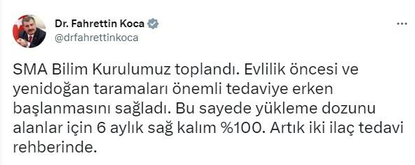 Taramalar sayesinde yükleme dozları için alanlar 6 aylık sağ kalımın yüzde 100 olduğunu vurgulayan Koca, SMA tedavisinin iki yere yönlendirildiği rehbere alındığını duyurdu.