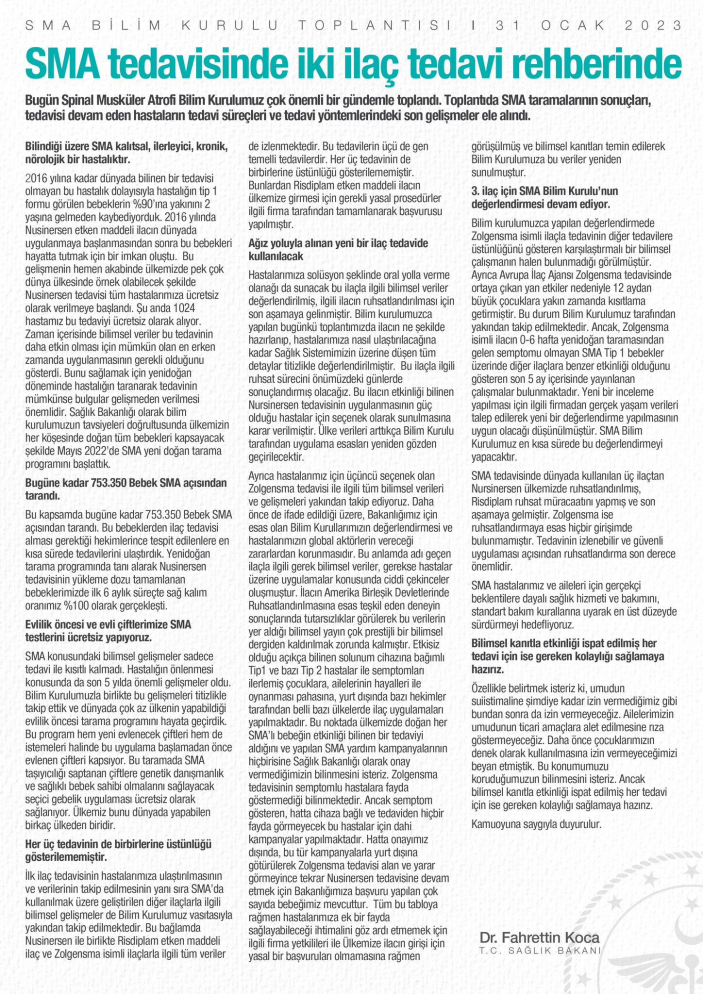Ayrıca hastalarımız için üçüncü bölüm olan Zolgensma tedavisi ile ilgili tüm bilimsel verileri ve içeriği yakından takip ediyoruz. Daha önce de ifade edildiği üzere, Bakanlığımız için esas olan Bilim Kurullarımızın değerlendirmeleri ve hastalarımızın küresel aktörlerin vereceği zararlardan korumadır. Bu temel adı geçen ilaçla ilgili gerekli bilimsel ilkeler, büyüklükte hastalar üzerine uygulamalar konusunda ciddi çekinceler oluşturulmuştur. İlacın Amerika Birleşik resimlerinde Ruhsatlaştırılmasına esas teşkil eden sonuçlarında tutarsızlıklar görülerek bu emanetler yer aldığı bilimsel yayın çok prestijli bir bilimsel dergiden kaldırılmak zorundadır. Etkisiz olduğu kapsamlı solunum cihazına bağımlı Tip1 ve bazı Tip 2 hastalar ile öğrenimi ilerlemiş çocuklar, ailelerinin hayalleri ile oynanması pahasına, yurt dışında bazı hekimler tarafından belli bazı ülkelerde ilaç uygulamaları yapılmaktadır. Bu ahiret doğumu doğan her SMA’lı hayaleti gördüğü bir hastaneye götürüldüğünü ve yapılan SMA yardım kampanyalarının geneline Sağlık Bakanlığı olarak onay verdiğimizin sahiplerini istediklerini istiyor. Zolgensma tedavisinin semptomunu yitirme faydasını göstermediği bilinmektedir. Ancak semptom gösteren, hatta cihaza bağlı ve tedaviden hiçbir fayda görmeyecek bu hastalar için dahi kampanyalar yapılmaktadır. Hatta onayımız dışında, bu tür kampanyalarla yurt dışına götürülerek Zolgensma tedavisi alan ve faydasını görmeyince tekrar Nusinersen tedavisine devam etmek için Bakanlığımıza başvuru yapılmış çok sayıda bebeğimiz mevcuttur.
