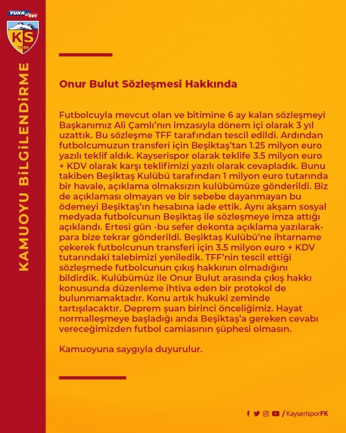 Yaşanan bu gerilimin ardından Kayserispor yönetimi, Beşiktaş ile mahkemede görüşeceklerini belirterek, Onur Bulut’un sözleşmesinde fesih maddesi olmadığını bir kez daha vurguladı.