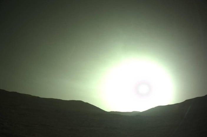 Perseverance tarafından çekilen fotoğraf, Güneş’in batarken Mars ufku üzerinde ilginç, soğuk mavimsi bir yeşil renkte parladığını gösteriyor.