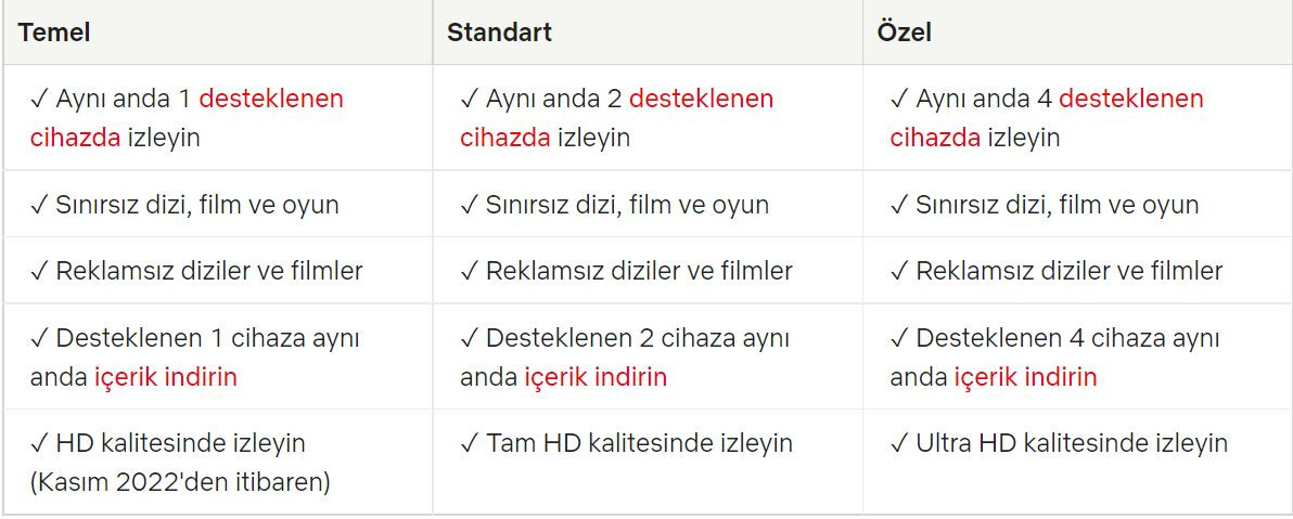 Netflix paketlerinin farklı fiyatlara sahip olmasının nedeni sahip oldukları özelliklerdir. Netflix Netflix’i planlıyor aynı anda görüntülenebilecek cihaz sayısı ve videoların Standart Tanımlı (SD), Yüksek Tanımlı (HD) veya Ultra Yüksek Tanımlı (UHD) olarak mı görüntülenebileceği özelliklerine göre farklılaşmaktadır. Netflix paketlerinin kapsamları ve özellikleri şunlardır: