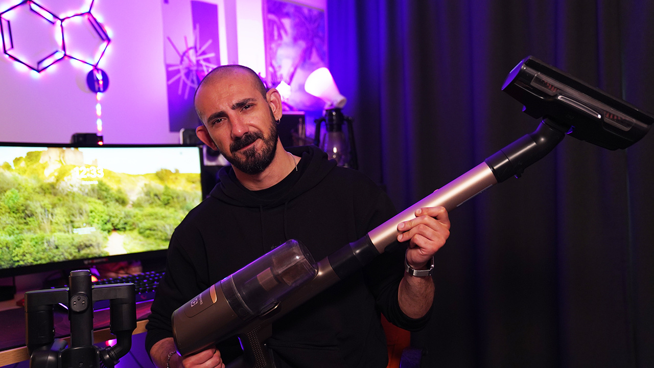 Süpürgenin dizaynı oldukça şık görünüyor. Tasarımla 2022 IF Tasarım Ödülü almış zaten. Ayrıca aşırı da ergonomik. Tek elle rahatlıkla kullanabiliyorsunuz. Özellikle bazı modellerde olduğu gibi çalıştırmak için herhangi bir tuşa basılı tutmanıza gerek yok, bu önemli bir avantaj. Açma kapama kısmı, mod seçenekleri üst kısmında; buradan rahatlıkla kontrol edebiliyorsunuz. Ayrıca bu alan boyutu süpürge hakkında tüm gücü sağlayan ekran. pil gitmek takip edebiliyor, çalışma modu, filtre ve uyarı bildirimlerini burada bir arada görebiliyorsunuz.