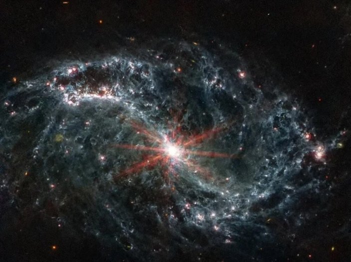 Araştırmacılar, galaksinin merkezinde yer alan çift halka yapısına sahip parlak bir yapının Webb’in aşırı yoğunluk ile oldukça ayrıntılı bir şekilde görülebildiğini söyledi.