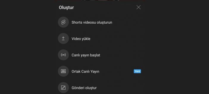 YouTube uygulamasını açın, “+” simgesi ile işaretlenmiş “Oluştur”a işletmek ve “Ortak Canlı Yayın” seçeneğini seçin.